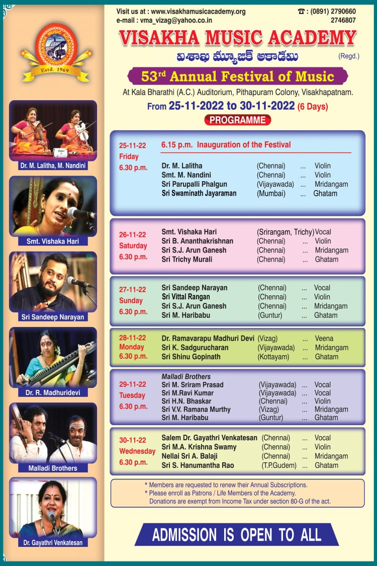 విశాఖ మ్యూజిక్ అకాడమి తన 53వ వార్షికోత్సవ సంగీత సభలను 25.11.22 నుండి 30.11.22 వరకు ఆరురోజులపాటు లబ్ధప్రతిష్ఠులైన సంగీత కళాకారుల సంగీతసభలతో జరుపుకుంది.